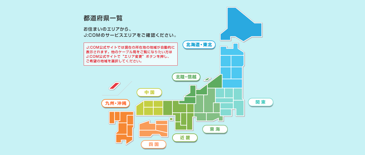 | 北海道 | 株式会社ジェイコム札幌J:COM 札幌 | 北海道札幌市中央区、白石区、厚別区、清田区、豊平区、南区、西区、東区、北区、北広島市西の里北、西の里東、虹ヶ丘 |