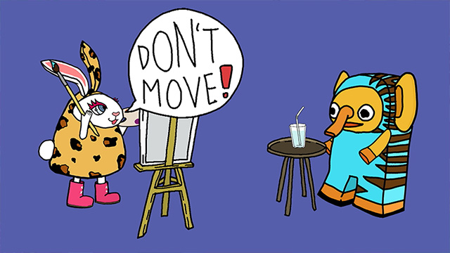 きびしい練習がいやになったパオッポとウサリーヌはあそびにいってしまう